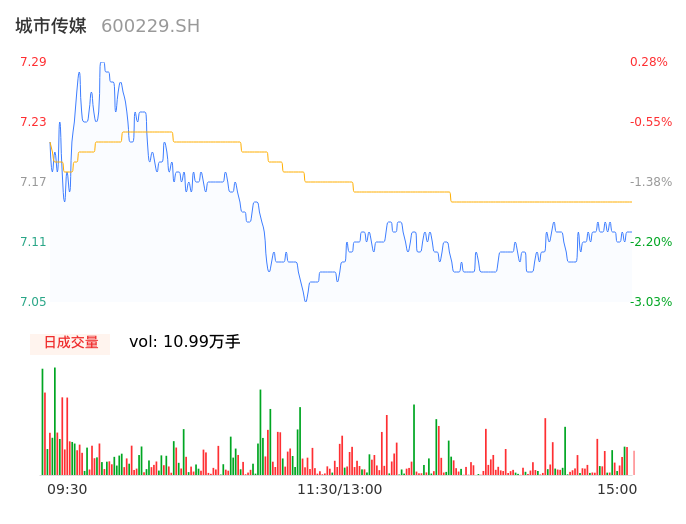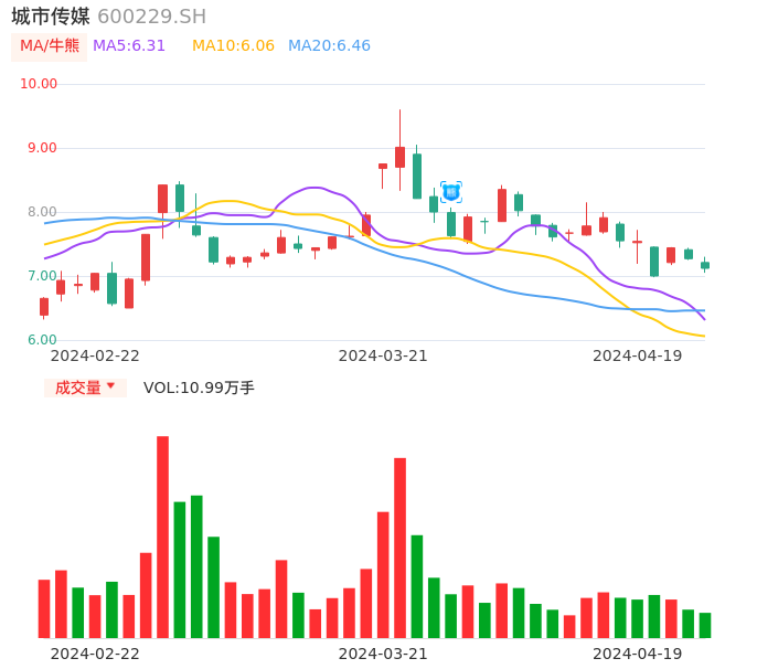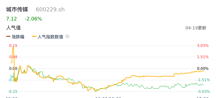 04月19日,城市传媒收报7.12,股价涨幅-2.06%,成交金额7852.83万元,换手率1.64%。