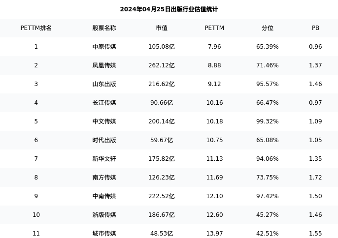 从估值角度看:城市传媒最新市盈率PETTM为13.97,在行业内排名11/29,处于42.51分位。
