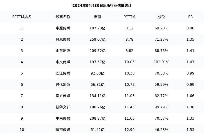 从估值角度看:城市传媒最新市盈率PETTM为12.90,在行业内排名10/29,处于46.28分位。
