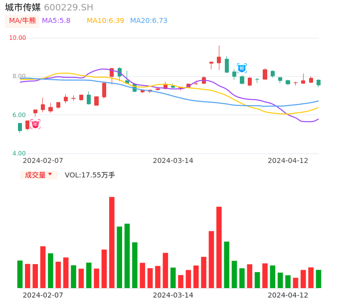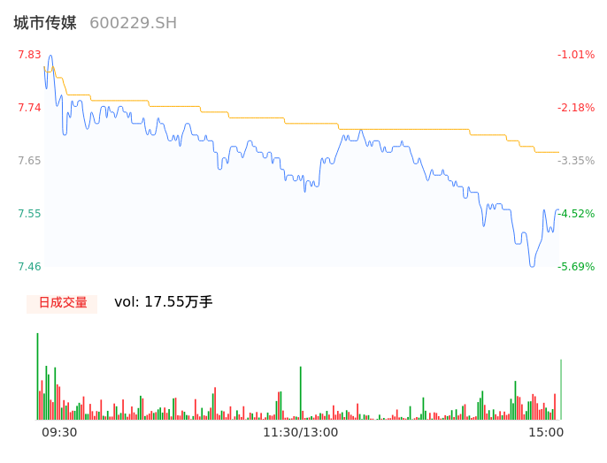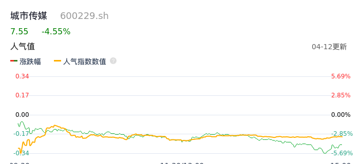 04月12日,城市传媒收报7.55,股价涨幅-4.55%,成交金额1.34亿元,换手率2.61%。