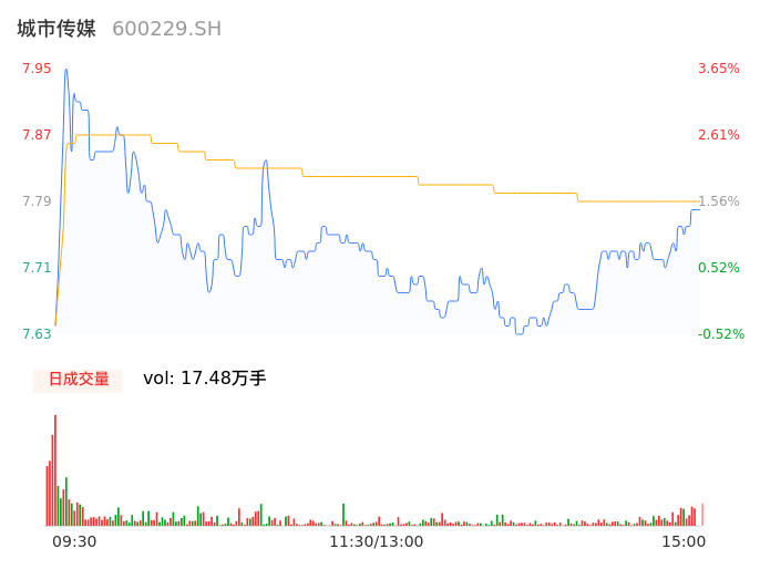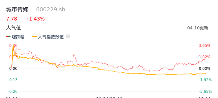 04月10日,城市传媒收报7.78,股价涨幅1.43%,成交金额1.36亿元,换手率2.60%。