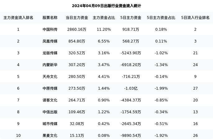 从主力资金流向来看,出版行业今日主力资金流入8.47亿元,在所有申万二级行业中排名:4/131。