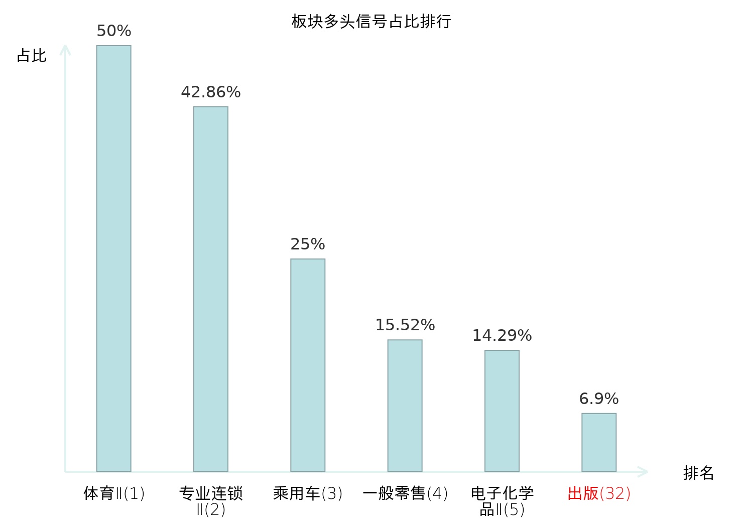 全市场所有行业板块中主力多头信号占比排名中,体育Ⅱ板块位居第一。体育Ⅱ板块名次提升最快,较昨日上升129位。