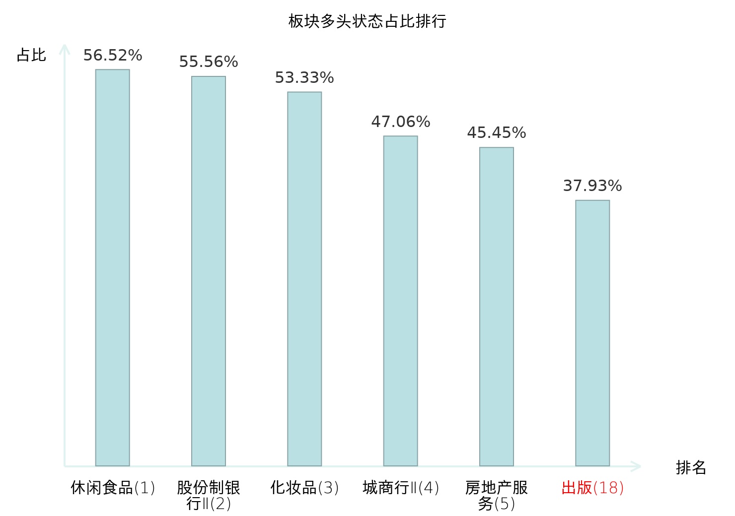 全市场所有行业板块中主力多头状态占比排名中,休闲食品板块位居第一。汽车服务板块名次提升最快,较昨日上升90位。