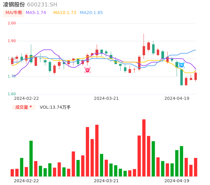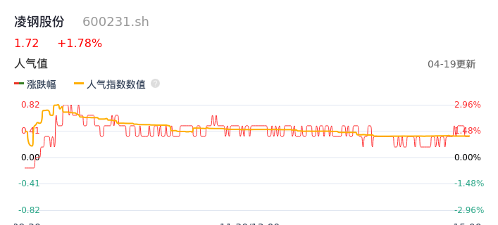 04月19日,凌钢股份收报1.72,股价涨幅1.78%,成交金额2357.13万元,换手率0.48%。