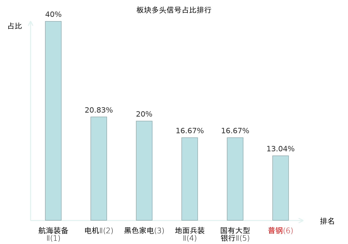 全市场所有行业板块中主力多头信号占比排名中,航海装备Ⅱ板块位居第一。国有大型银行Ⅱ板块名次提升最快,较昨日上升119位。
