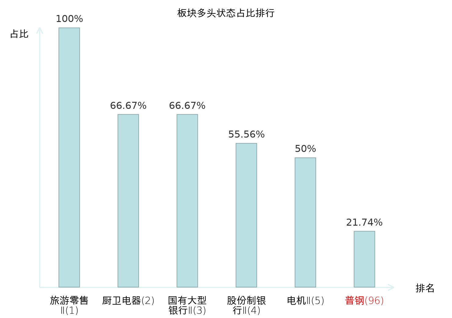 全市场所有行业板块中主力多头状态占比排名中,旅游零售Ⅱ板块位居第一。水泥板块名次提升最快,较昨日上升80位。