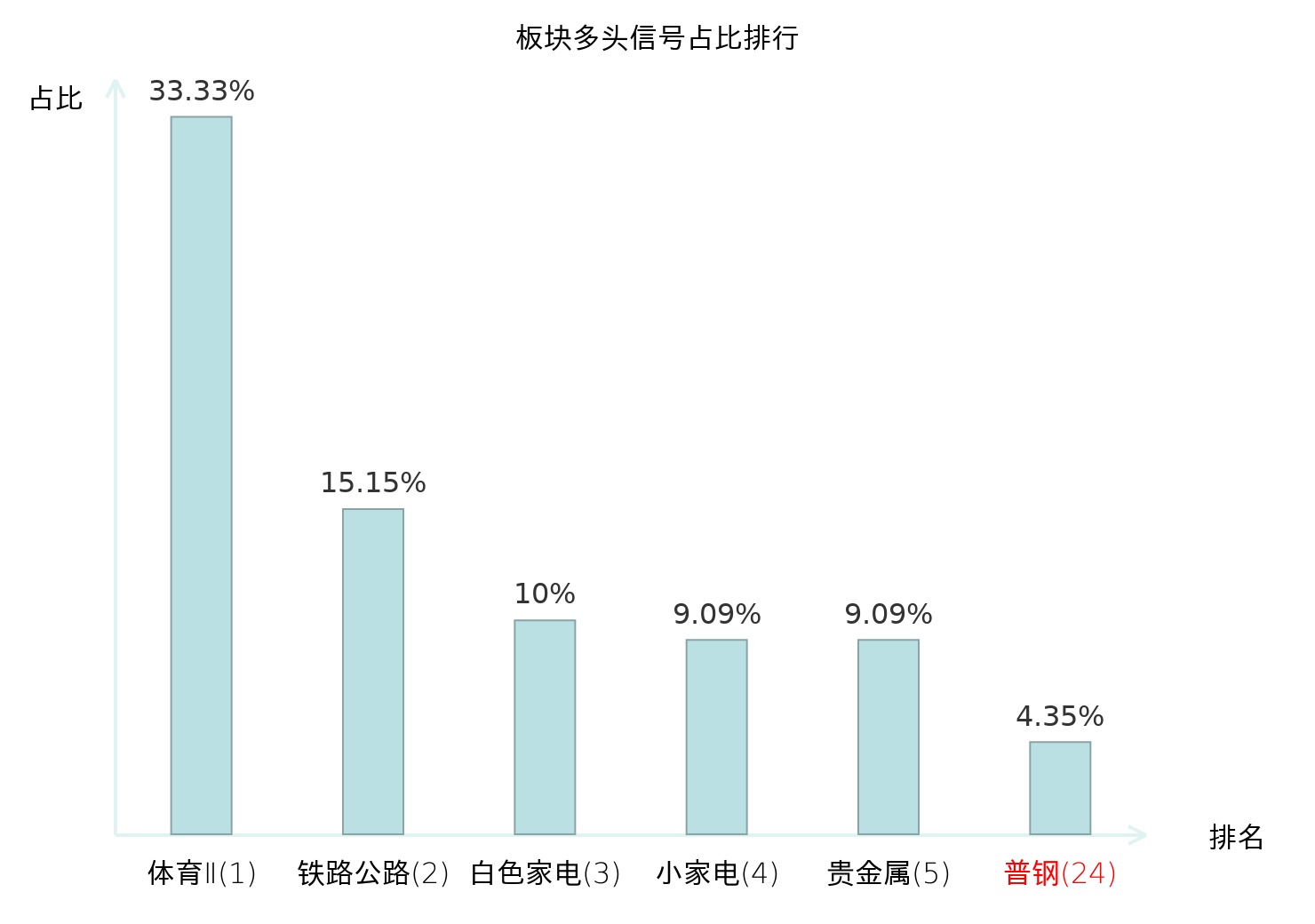 全市场所有行业板块中主力多头信号占比排名中,体育Ⅱ板块位居第一。体育Ⅱ板块名次提升最快,较昨日上升129位。