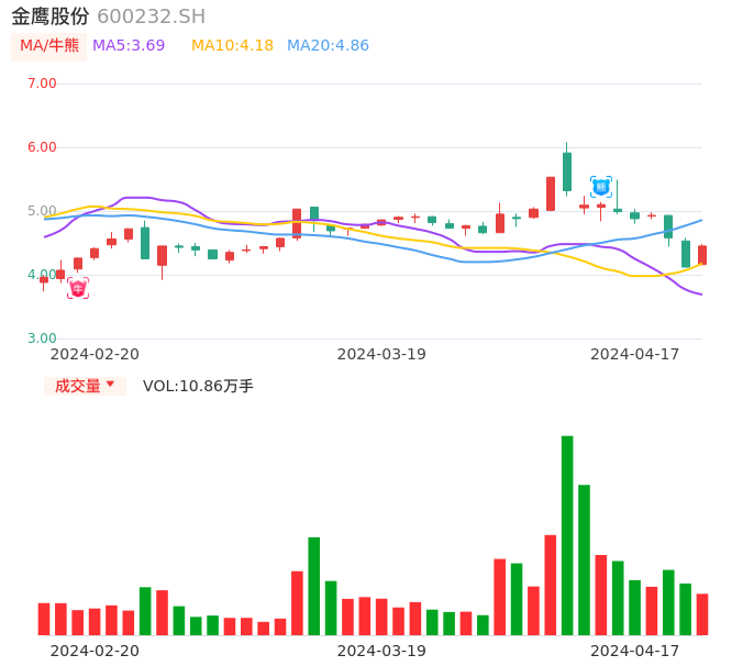 04月17日,金鹰股份收报4.45,股价涨幅8.01%,成交金额4764.53万元,换手率2.98%。