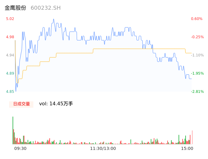 04月11日,金鹰股份收报4.88,股价涨幅-2.20%,成交金额7136.57万元,换手率3.96%。