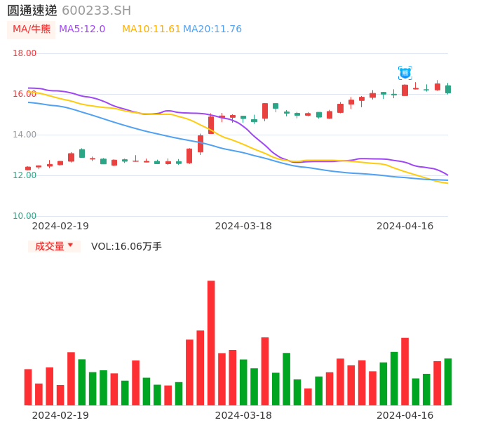 04月16日,圆通速递收报16.05,股价涨幅-2.73%,成交金额2.61亿元,换手率0.47%。