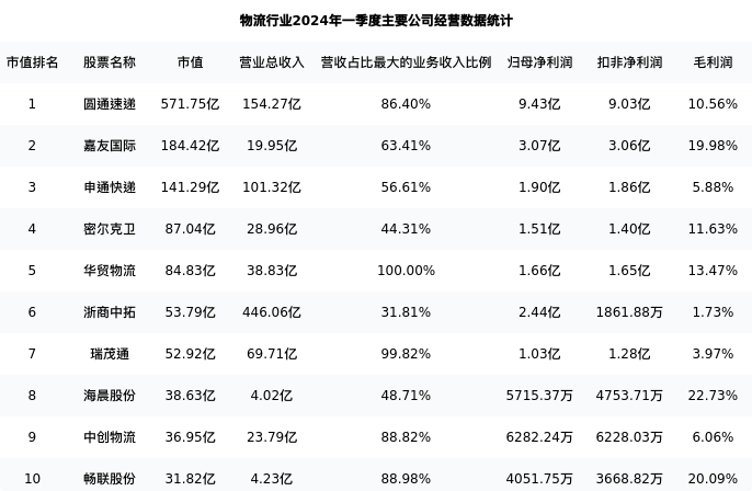 圆通速递最新报告期数据为一季度,下表汇总了物流行业内市值靠前的公司一季度主要经营数据