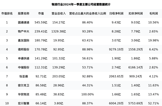 圆通速递最新报告期数据为一季度,下表汇总了物流行业内市值靠前的公司一季度主要经营数据