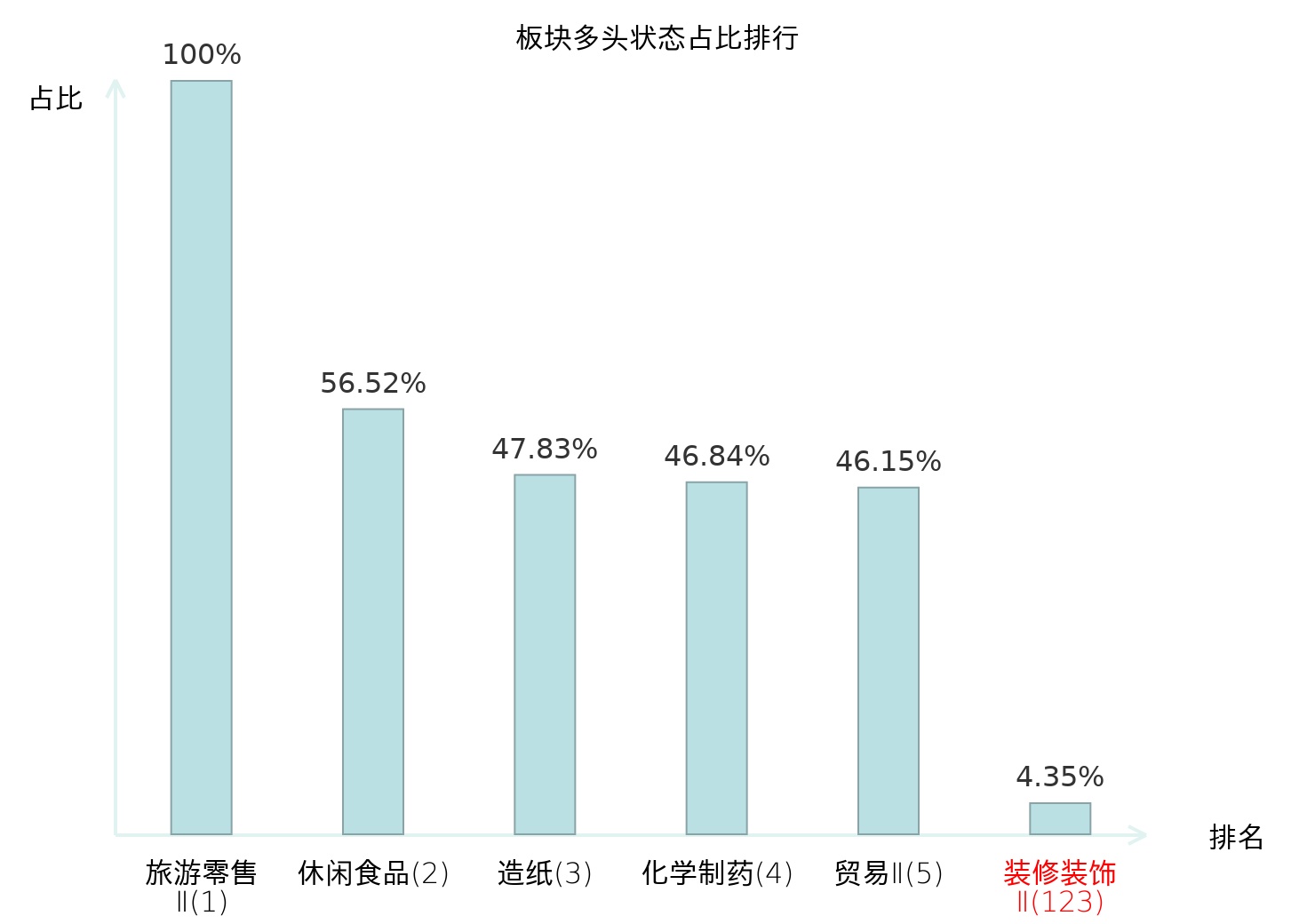 全市场所有行业板块中主力多头状态占比排名中,旅游零售Ⅱ板块位居第一。动物保健Ⅱ板块名次提升最快,较昨日上升58位。