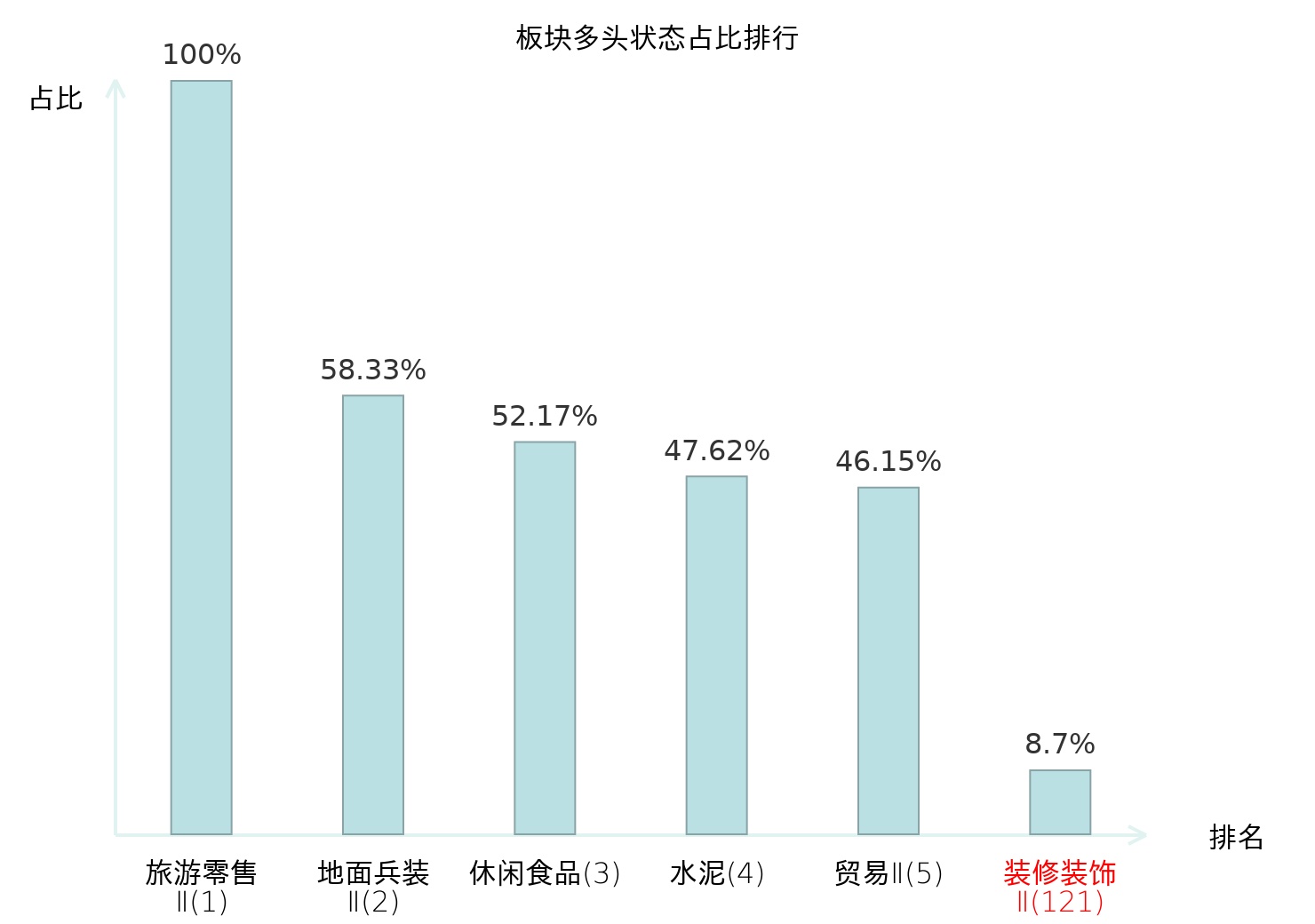 全市场所有行业板块中主力多头状态占比排名中,旅游零售Ⅱ板块位居第一。焦炭Ⅱ板块名次提升最快,较昨日上升82位。