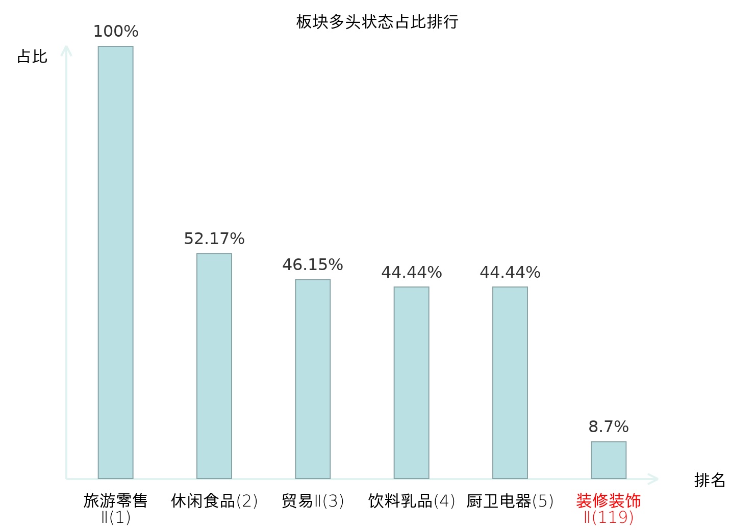 全市场所有行业板块中主力多头状态占比排名中,旅游零售Ⅱ板块位居第一。乘用车板块名次提升最快,较昨日上升91位。