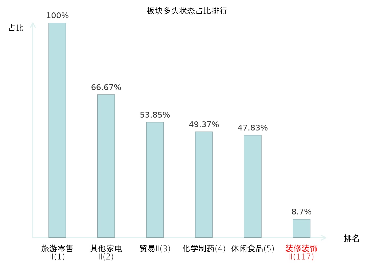全市场所有行业板块中主力多头状态占比排名中,旅游零售Ⅱ板块位居第一。互联网电商板块名次提升最快,较昨日上升55位。
