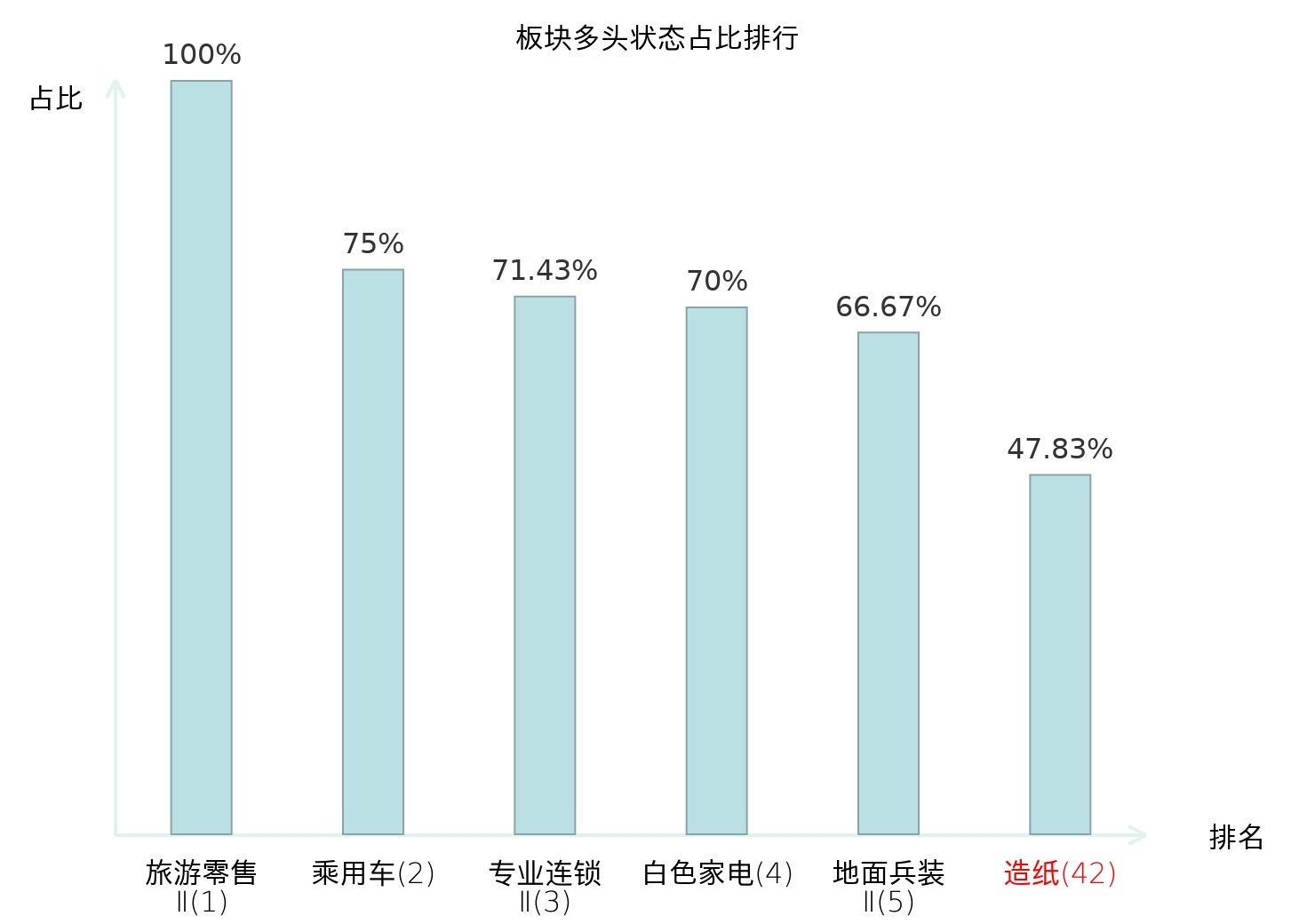 全市场所有行业板块中主力多头状态占比排名中,旅游零售Ⅱ板块位居第一。焦炭Ⅱ板块名次提升最快,较昨日上升105位。