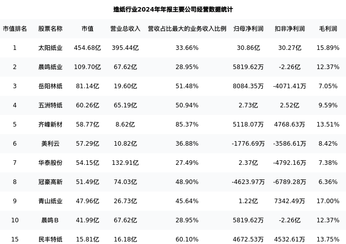 民丰特纸最新报告期数据为年报,下表汇总了造纸行业内市值靠前的公司年报主要经营数据