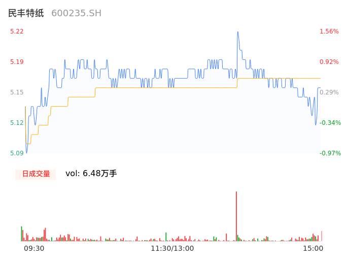 04月11日,民丰特纸收报5.16,股价涨幅0.39%,成交金额3346.37万元,换手率1.84%。