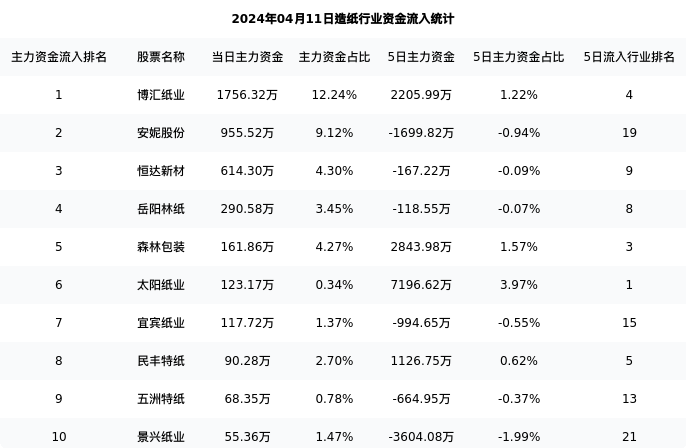 从主力资金流向来看,造纸行业今日主力资金流入5.03亿元,在所有申万二级行业中排名:116/131。