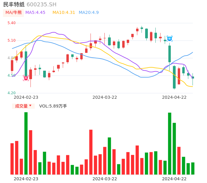 04月22日,民丰特纸收报4.45,股价涨幅-1.11%,成交金额2617.06万元,换手率1.68%。