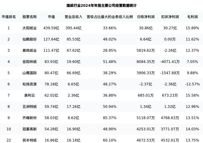 民丰特纸最新报告期数据为年报,下表汇总了造纸行业内市值靠前的公司年报主要经营数据