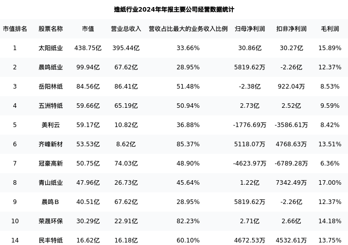 民丰特纸最新报告期数据为年报,下表汇总了造纸行业内市值靠前的公司年报主要经营数据