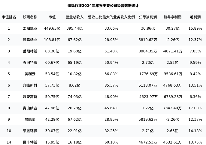 民丰特纸最新报告期数据为年报,下表汇总了造纸行业内市值靠前的公司年报主要经营数据