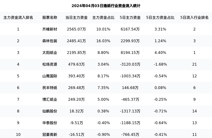 从主力资金流向来看,造纸行业今日主力资金流入4.89亿元,在所有申万二级行业中排名:69/131。