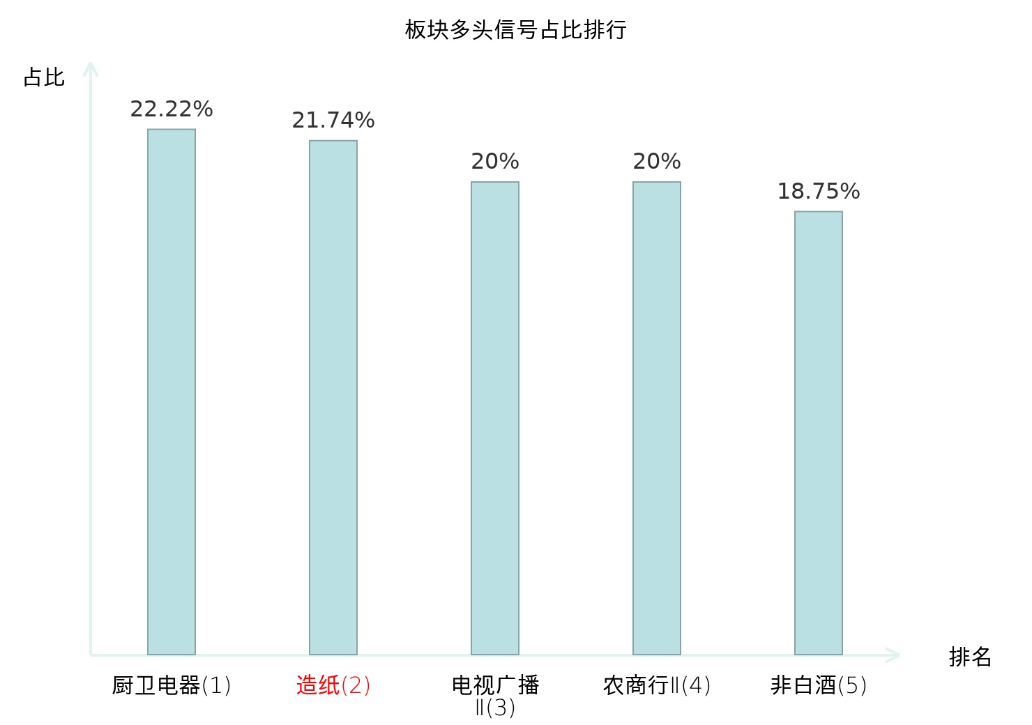 全市场所有行业板块中主力多头信号占比排名中,厨卫电器板块位居第一。厨卫电器板块名次提升最快,较昨日上升115位。