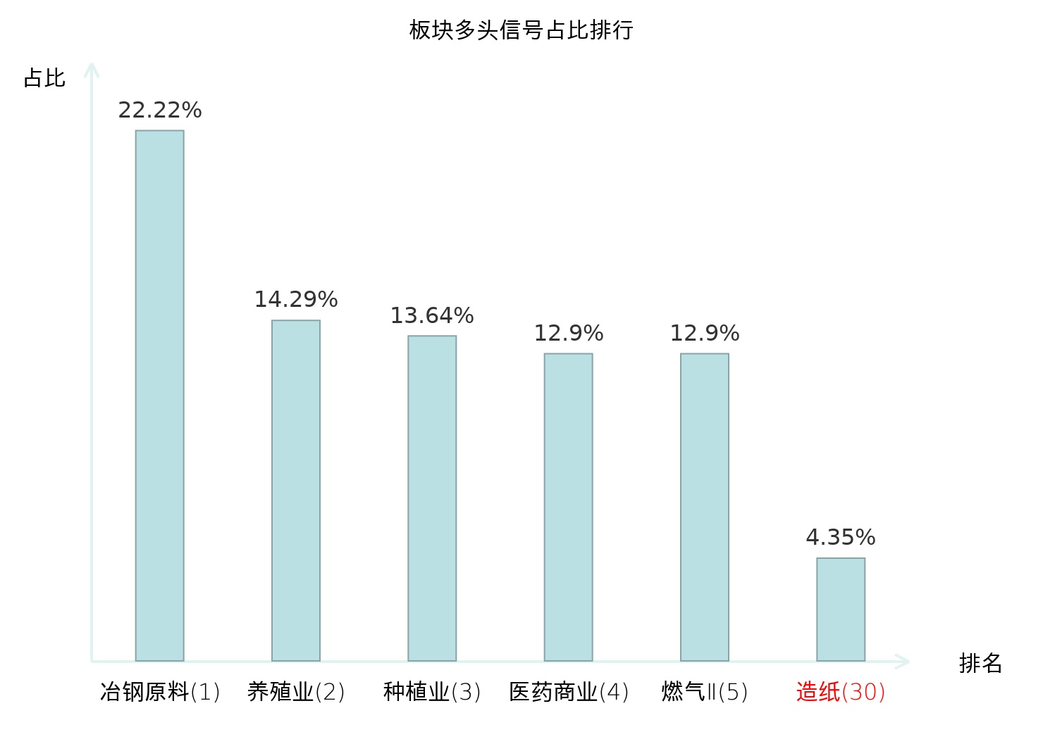 全市场所有行业板块中主力多头信号占比排名中,冶钢原料板块位居第一。航天装备Ⅱ板块名次提升最快,较昨日上升114位。