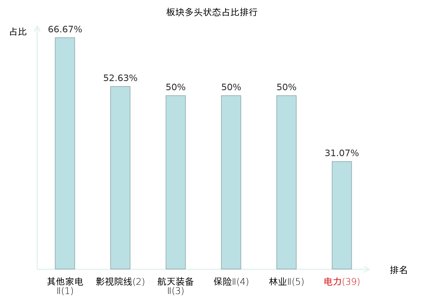 全市场所有行业板块中主力多头状态占比排名中,其他家电Ⅱ板块位居第一。林业Ⅱ板块名次提升最快,较昨日上升76位。