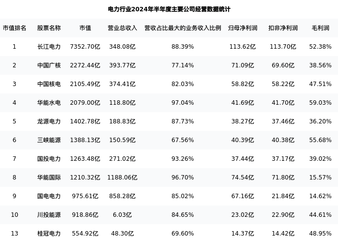 桂冠电力最新报告期数据为半年度,下表汇总了电力行业内市值靠前的公司半年度主要经营数据