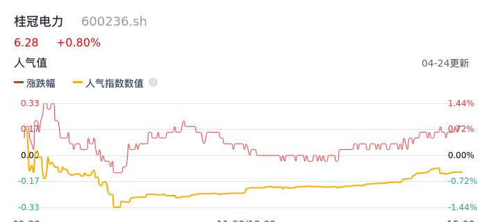 04月24日,桂冠电力收报6.28,股价涨幅0.80%,成交金额6385.20万元,换手率0.13%。