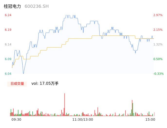 04月15日,桂冠电力收报6.17,股价涨幅1.82%,成交金额1.05亿元,换手率0.22%。