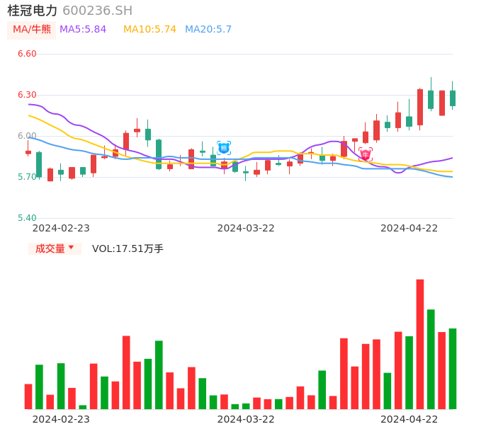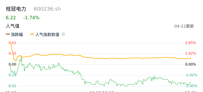04月22日,桂冠电力收报6.22,股价涨幅-1.74%,成交金额1.10亿元,换手率0.22%。