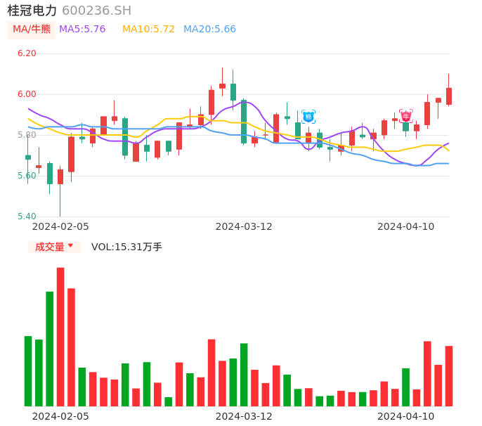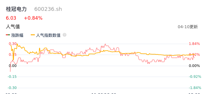 04月10日,桂冠电力收报6.03,股价涨幅0.84%,成交金额9235.91万元,换手率0.19%。
