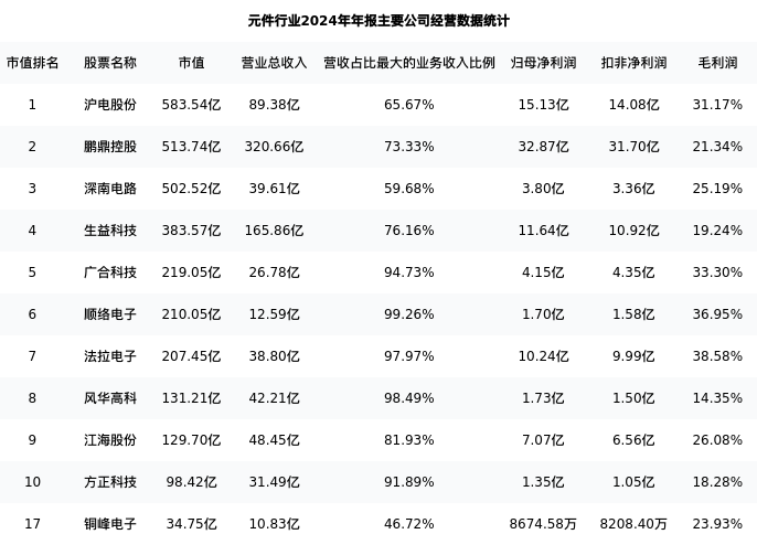 铜峰电子最新报告期数据为年报,下表汇总了元件行业内市值靠前的公司年报主要经营数据