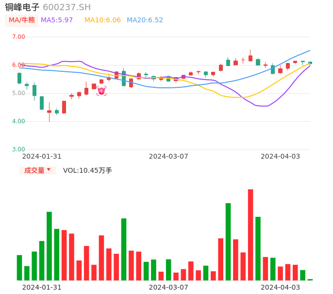04月03日,铜峰电子收报6.04,股价涨幅-1.15%,成交金额6298.63万元,换手率1.73%。