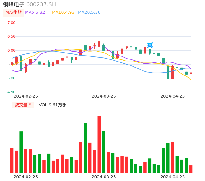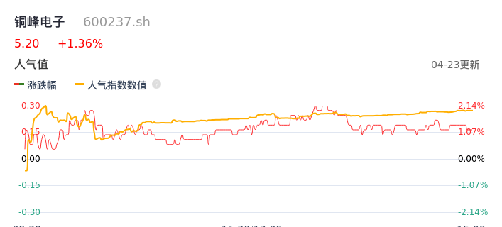 04月23日,铜峰电子收报5.20,股价涨幅1.36%,成交金额4985.84万元,换手率1.59%。