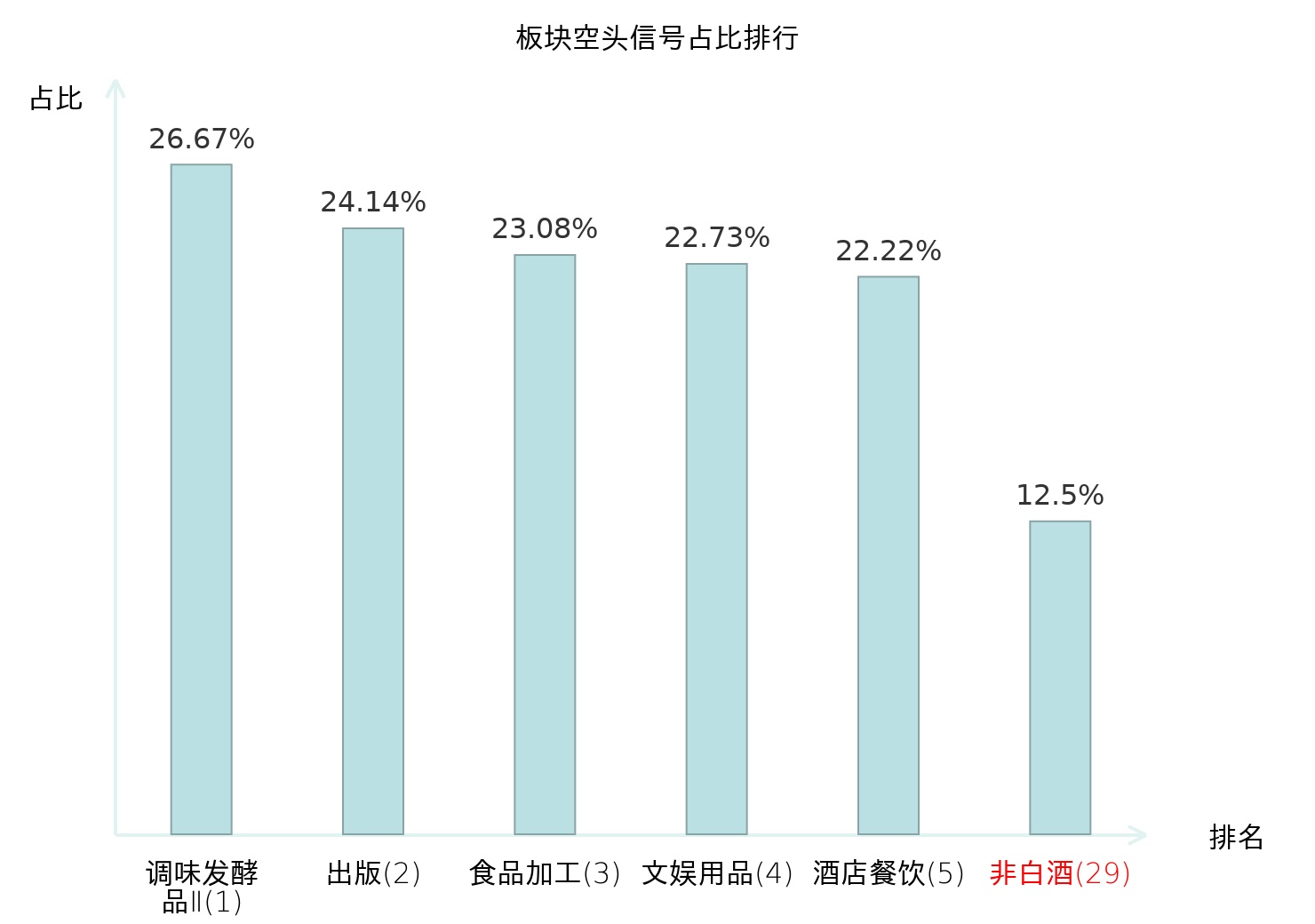 全市场所有行业板块中主力空头信号占比排名中,调味发酵品Ⅱ板块位居第一。中药Ⅱ板块名次提升最快,较昨日上升110位。