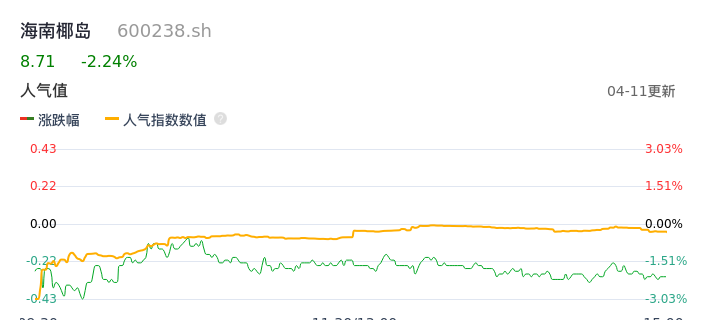 04月11日,海南椰岛收报8.71,股价涨幅-2.24%,成交金额6297.27万元,换手率1.62%。