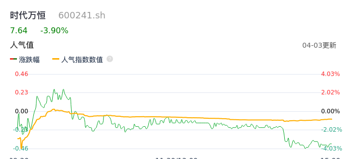 04月03日,时代万恒收报7.64,股价涨幅-3.90%,成交金额1.47亿元,换手率6.33%。