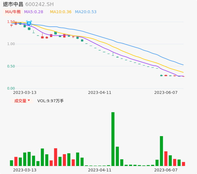 06月07日,退市中昌收报0.27,股价涨幅0.00%,成交金额262.52万元,换手率2.21%。