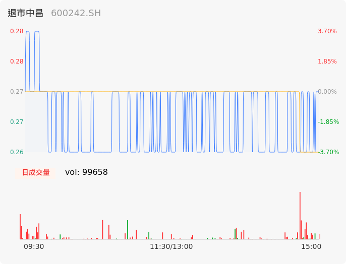 06月07日,退市中昌收报0.27,股价涨幅0.00%,成交金额262.52万元,换手率2.21%。