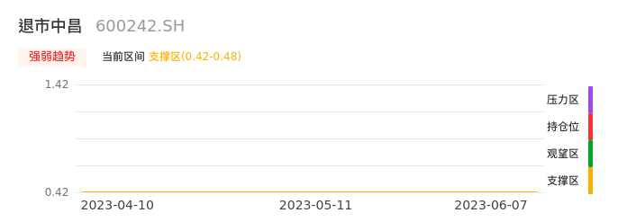 我们来看一下该股的九方特色指标强弱趋势的情况:退市中昌自04月03日进入支撑区。股价出现一波急速下跌行情,目前下跌动能有所衰竭。注意今日上方压力位:0.42元。