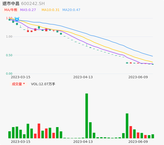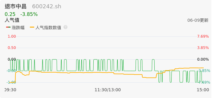 06月09日,退市中昌收报0.25,股价涨幅-3.85%,成交金额302.62万元,换手率2.68%。
