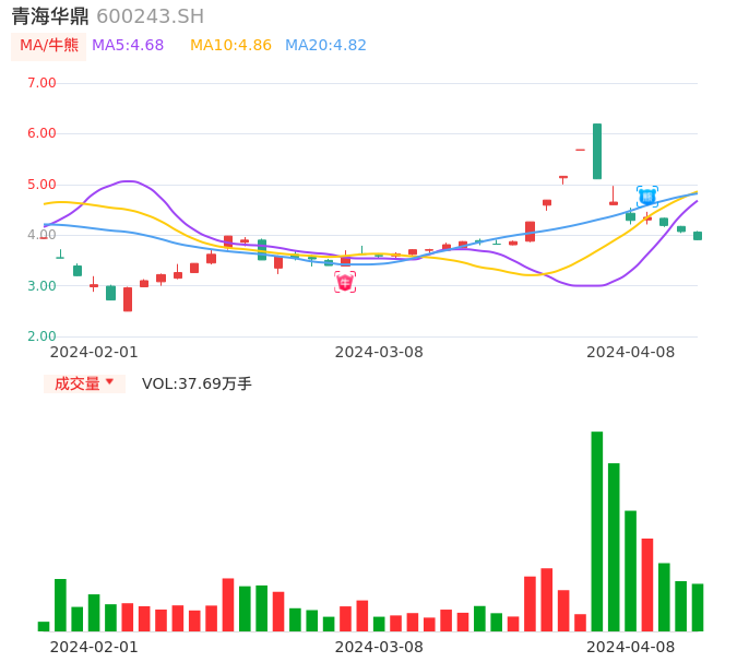 04月08日,青海华鼎收报3.91,股价涨幅-3.93%,成交金额1.50亿元,换手率8.59%。