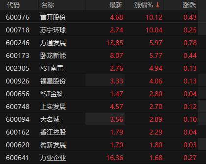 上证报中国证券网讯 9月10日早盘,房地产开发板块震荡拉升,截至9时45分,首开股份涨停,走出6连板,苏宁环球2连板,万通发展、卧龙新能、福星股份等跟涨。